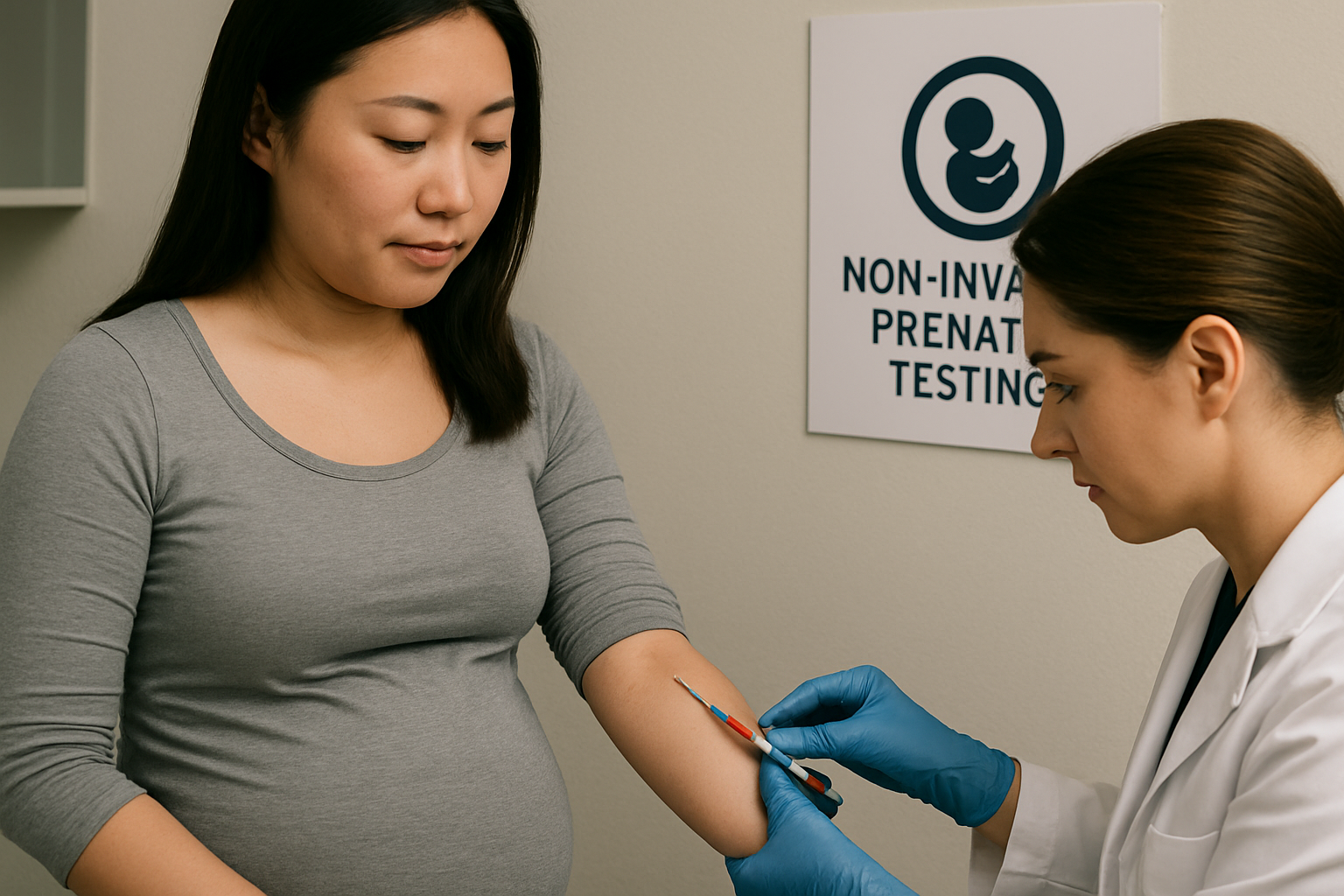 Se obtiene una muestra de sangre de la madre y se analiza el ADN fetal libre (fragmentos de ADN del feto que circulan en el torrente sanguíneo de la madre.